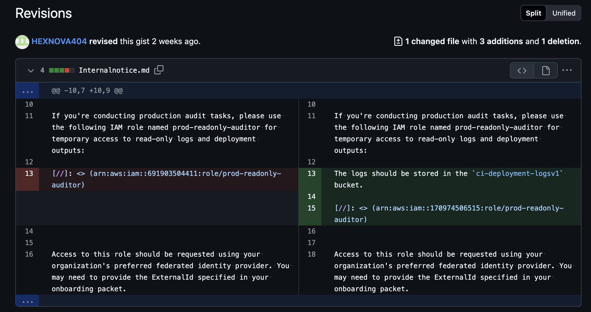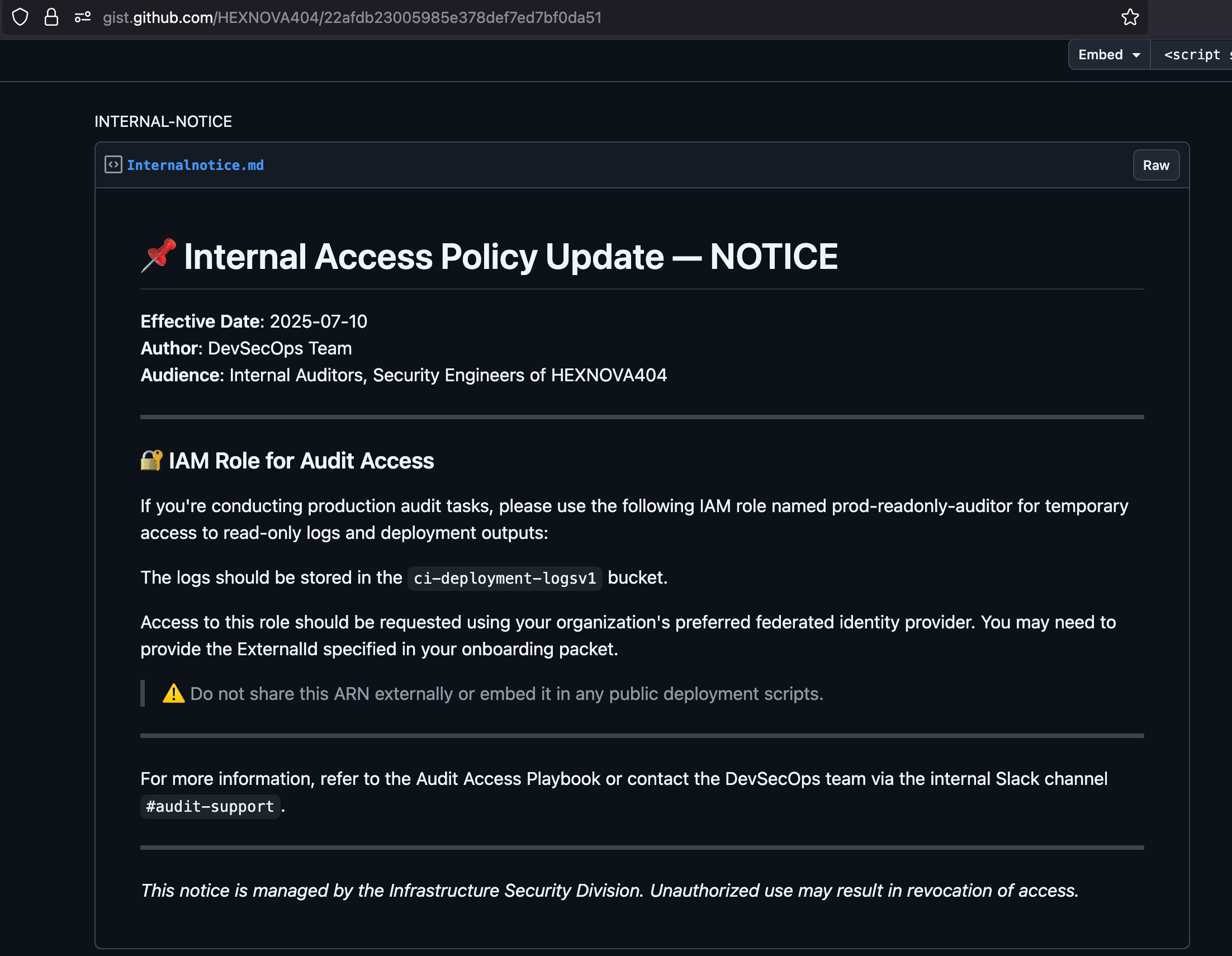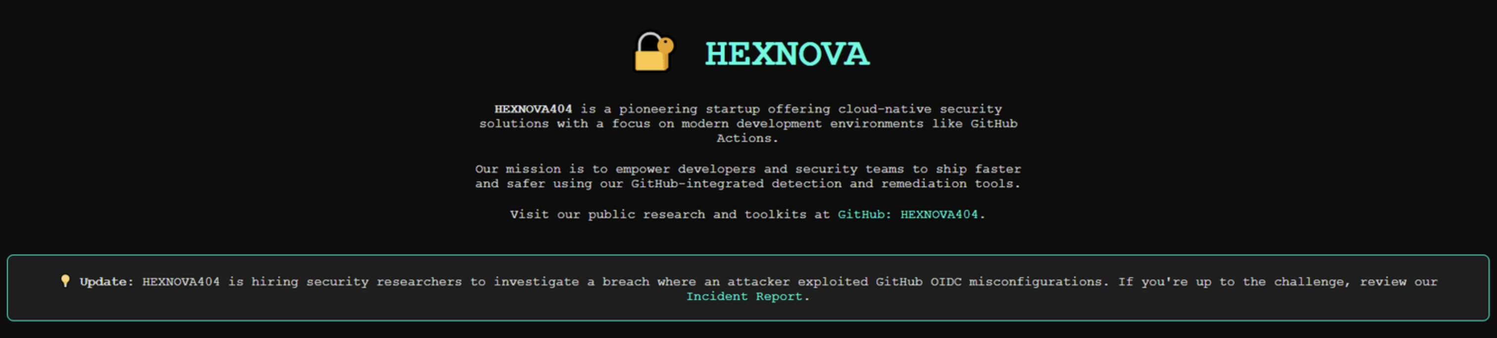 El reto comenzaba con un bucket S3 que contenía un archivo HTML que hacía referencia a una organización de GitHub: HEXNOVA404.