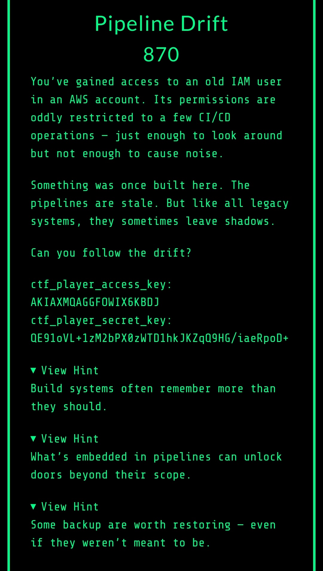 "Drift" es un término usado con infraestructura que se ha desviado de su estado esperado, a veces causando brechas de seguridad. Como ya teníamos unas credenciales de AWS, empezamos con enumeración básica: