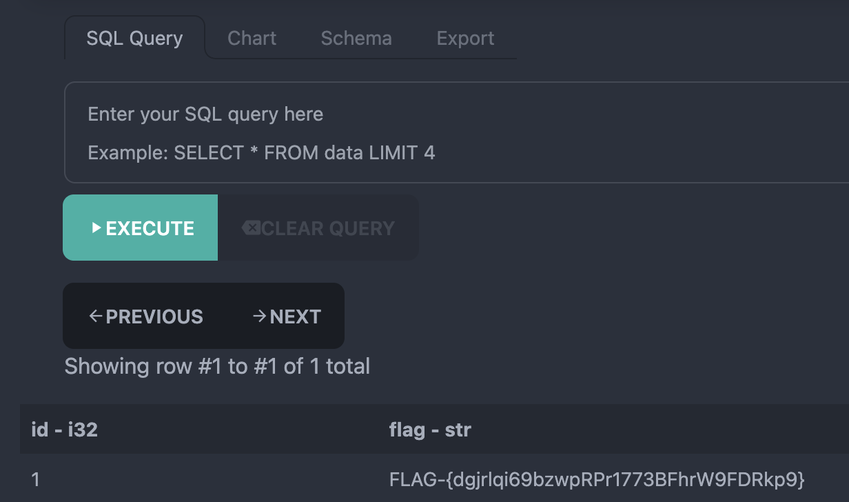 Después de descargar los archivos Parquet, analizamos el contenido de la base de datos usando un visor de Parquet online y encontramos la flag en la tabla secrets