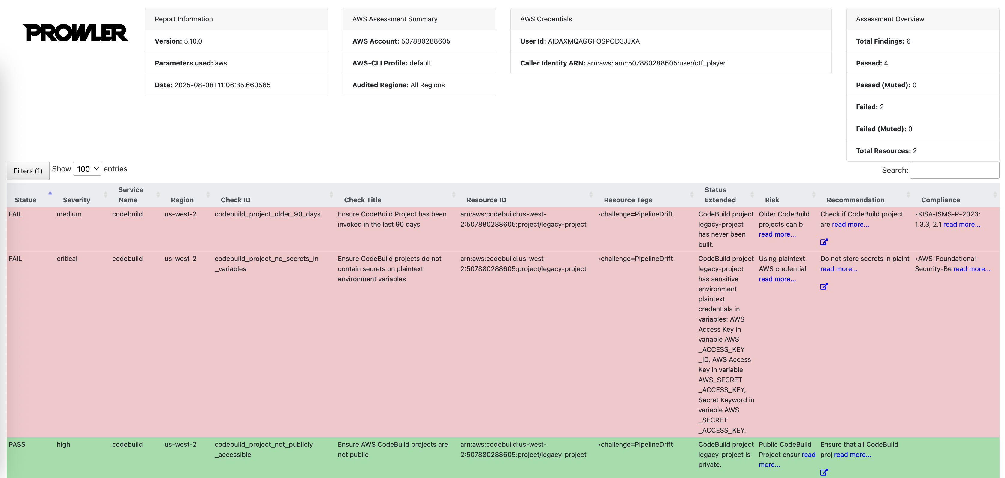 Bueno... aquí Andoni al habla, trabajo para Prowler, así que quería ver si podía ser útil en el CTF. Lo estaba ejecutando en paralelo mientras probaba cosas para ver qué posibles configuraciones incorrectas podía tener el servicio CodeBuild.